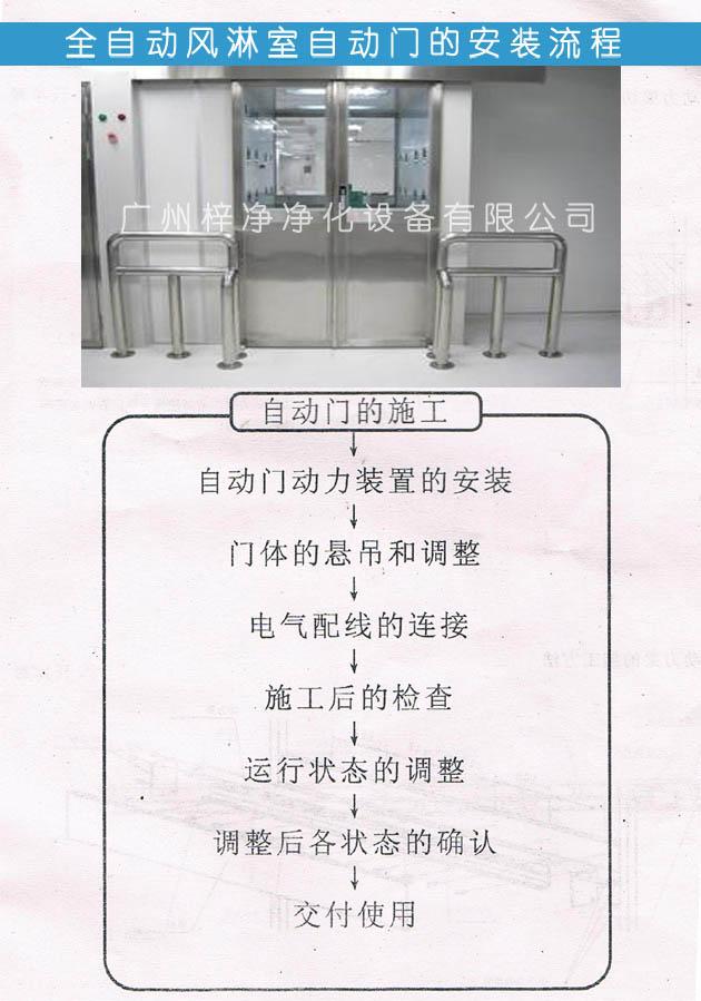 風淋室安裝>>自動門動力裝置的安裝>>門體的懸吊和調整>>電氣配線的連接>>施工后的檢查>>運行狀態的調整>>調整后各狀態的確認>>交付使用。